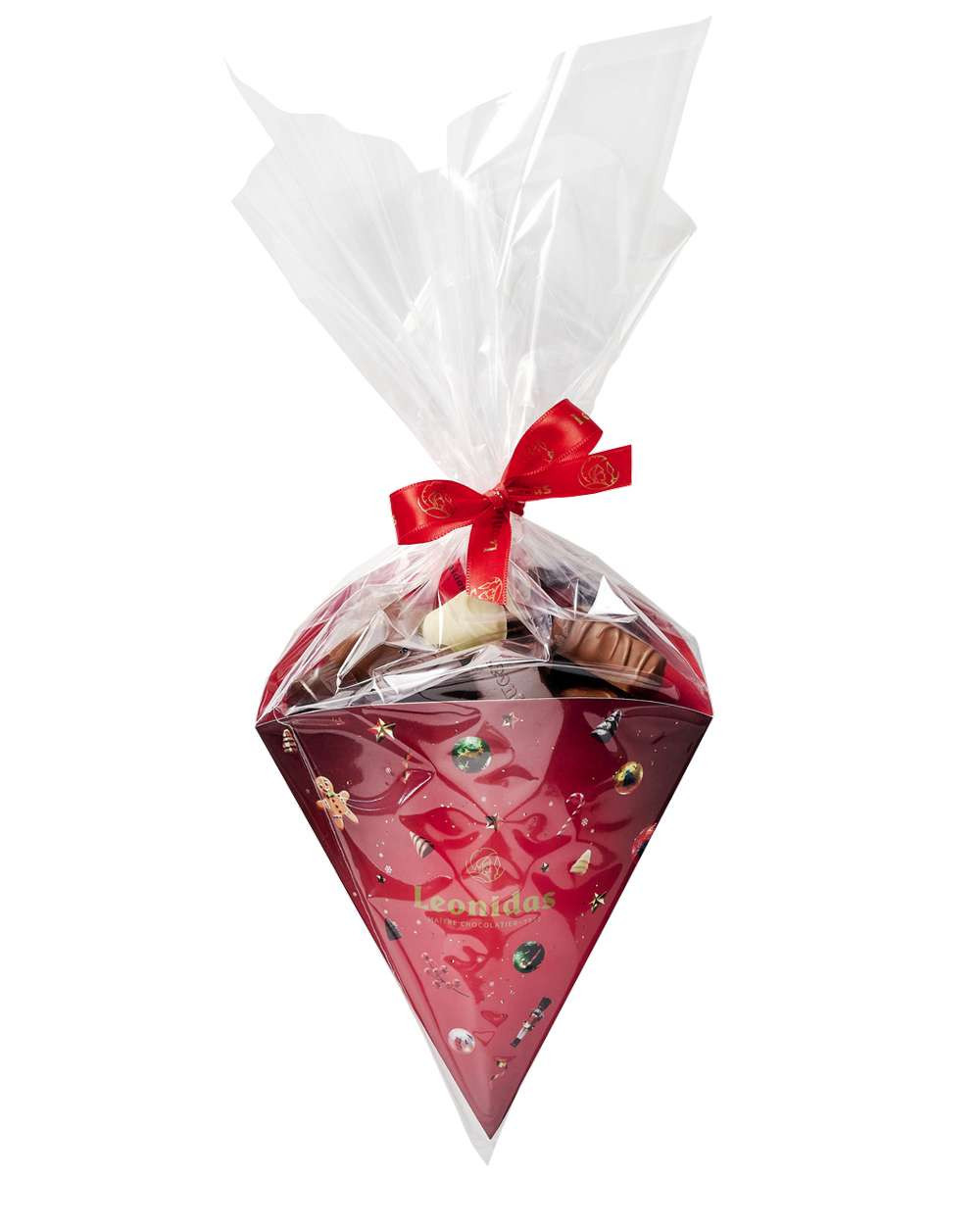 Ce cône élégant aux couleurs Leonidas renferme environ 300 g d’un assortiment de pralines belges :