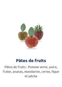 Ingrédients : fruits, sucre, sirop de glucose, gélifiant : pectine, acidifiant : acide citrique, correcteur d’acidité : citrate de sodium, colorants (curcumine, carmin, complexes cuivre-chlorophylles, caramel ordinaire), arômes.