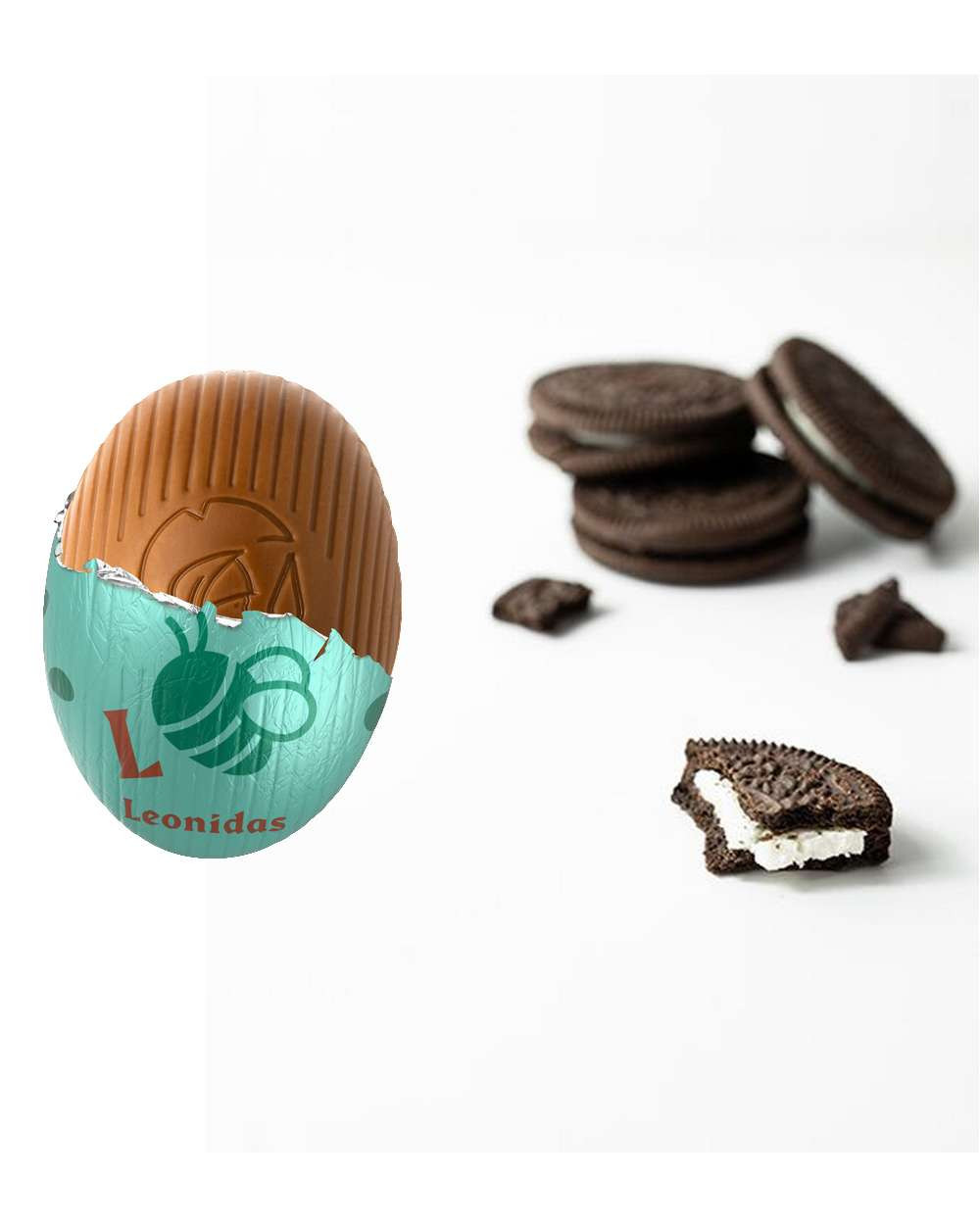 Petit œuf en chocolat au lait, garni d’un praliné onctueux aux éclats de biscuits cacao. Une gourmandise de Pâques moderne et généreuse, qui associe la douceur du chocolat au lait à la note gourmande et croquante des biscuits type cookies.