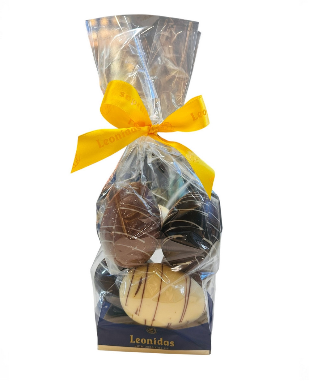 Découvrez un assortiment raffiné de 6 œufs bicolores en chocolat belge Leonidas soigneusement présentés en sachet.