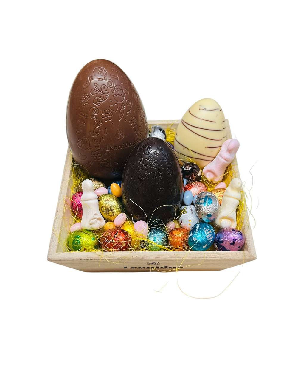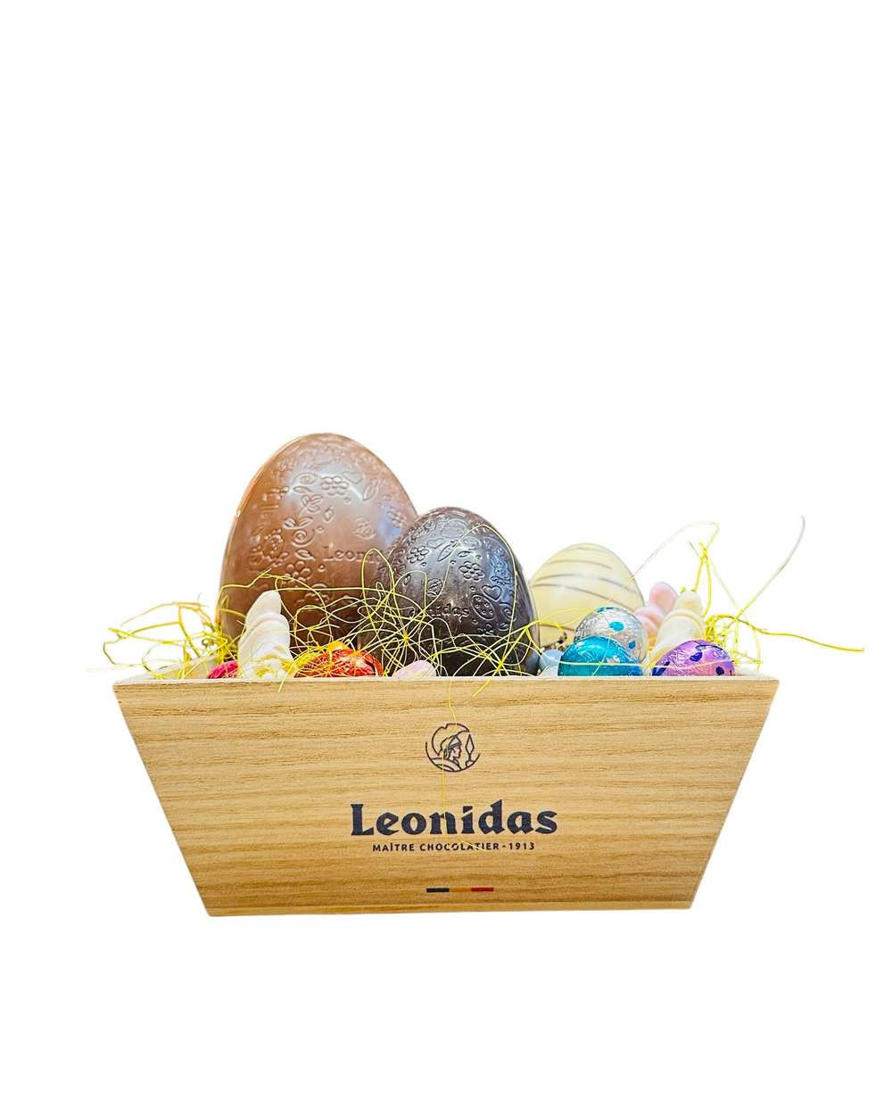 Craquez pour ce panier garni d’un assortiment d’œufs de Pâques Leonidas, une sélection gourmande de chocolats belges aux recettes variées.