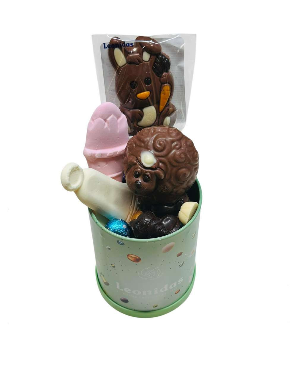 Craquez pour ce tube de Pâques garni d’un assortiment d’œufs en chocolat Leonidas.