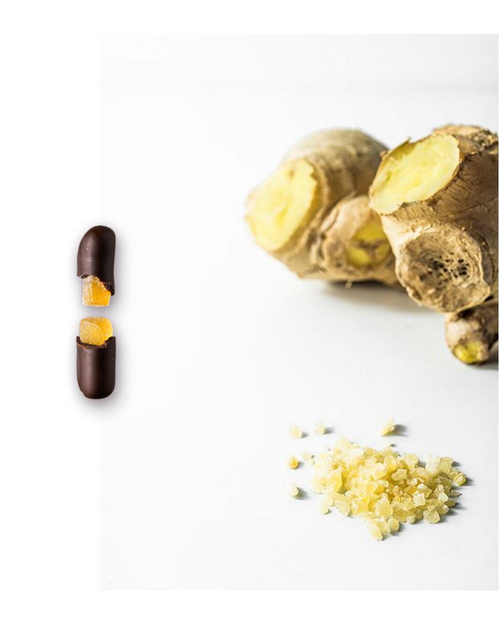 Morceaux de gingembre confit enrobés de chocolat noir Leonidas. Une gourmandise de caractère qui associe l’intensité du chocolat noir à la note épicée et légèrement piquante du gingembre.
