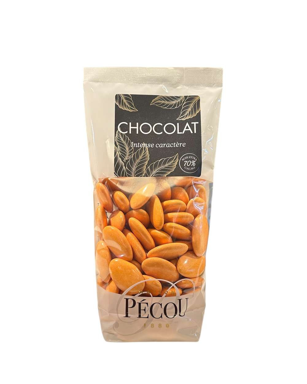 Élaborées par la Maison Pécou, ces dragées d’exception marient la puissance d’un chocolat noir à 70 % de cacao à la finesse d’une coque croquante couleur Orange.