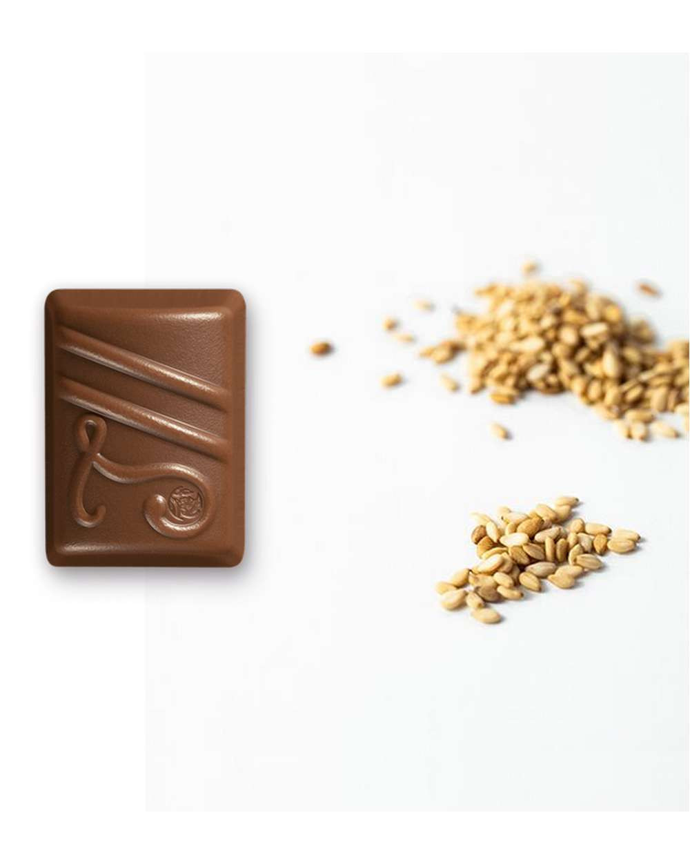 Praline enrobée de chocolat au lait, composée d’un double cœur de nougat et de sésame. Une création gourmande qui associe la douceur du nougat à la note toastée du sésame.