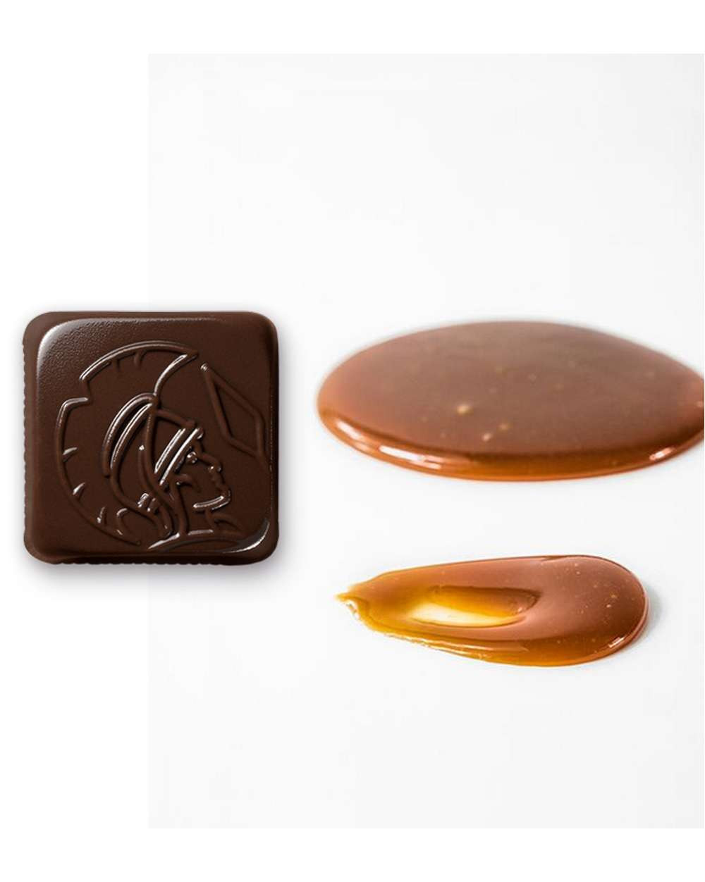 Praline enrobée de chocolat noir, garnie d’un caramel fondant à la fleur de sel de Guérande. Une création gourmande qui associe l’intensité du chocolat noir à l’équilibre subtil du caramel salé.