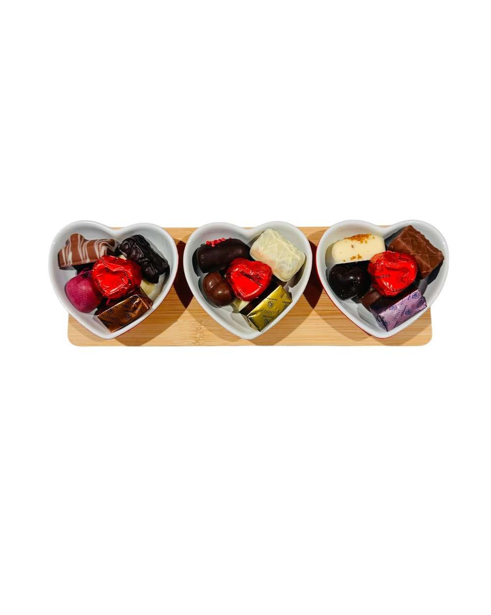 Ce plateau élégant est composé de trois coupelles en forme de cœur, disposées sur un support raffiné et garnies d’environ 275 g d’assortiment de chocolats Leonidas.