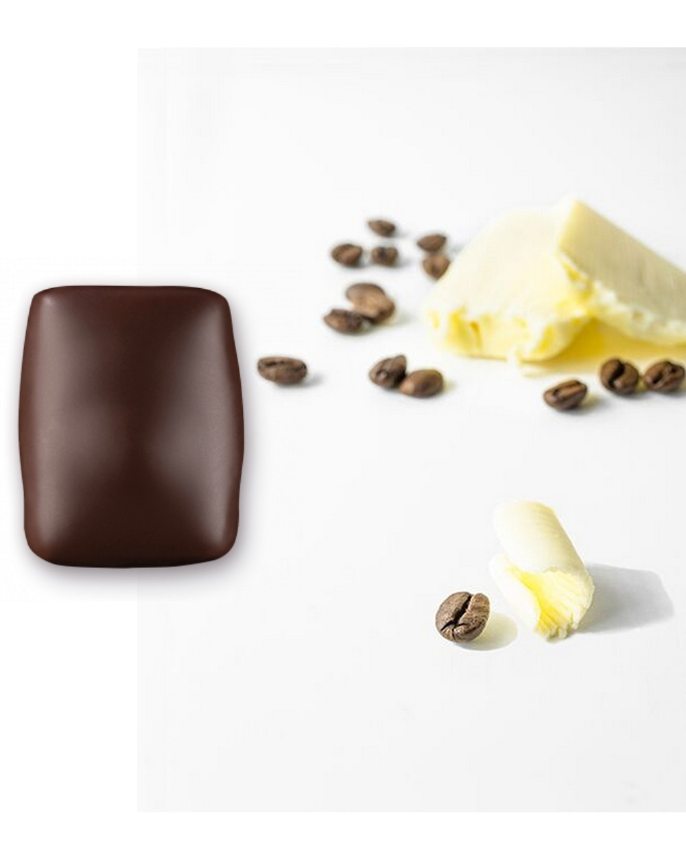 Praline au chocolat blanc avec crème au beurre parfumée au café, sur une fine couche de praliné, surmontée d’une noisette entière.
