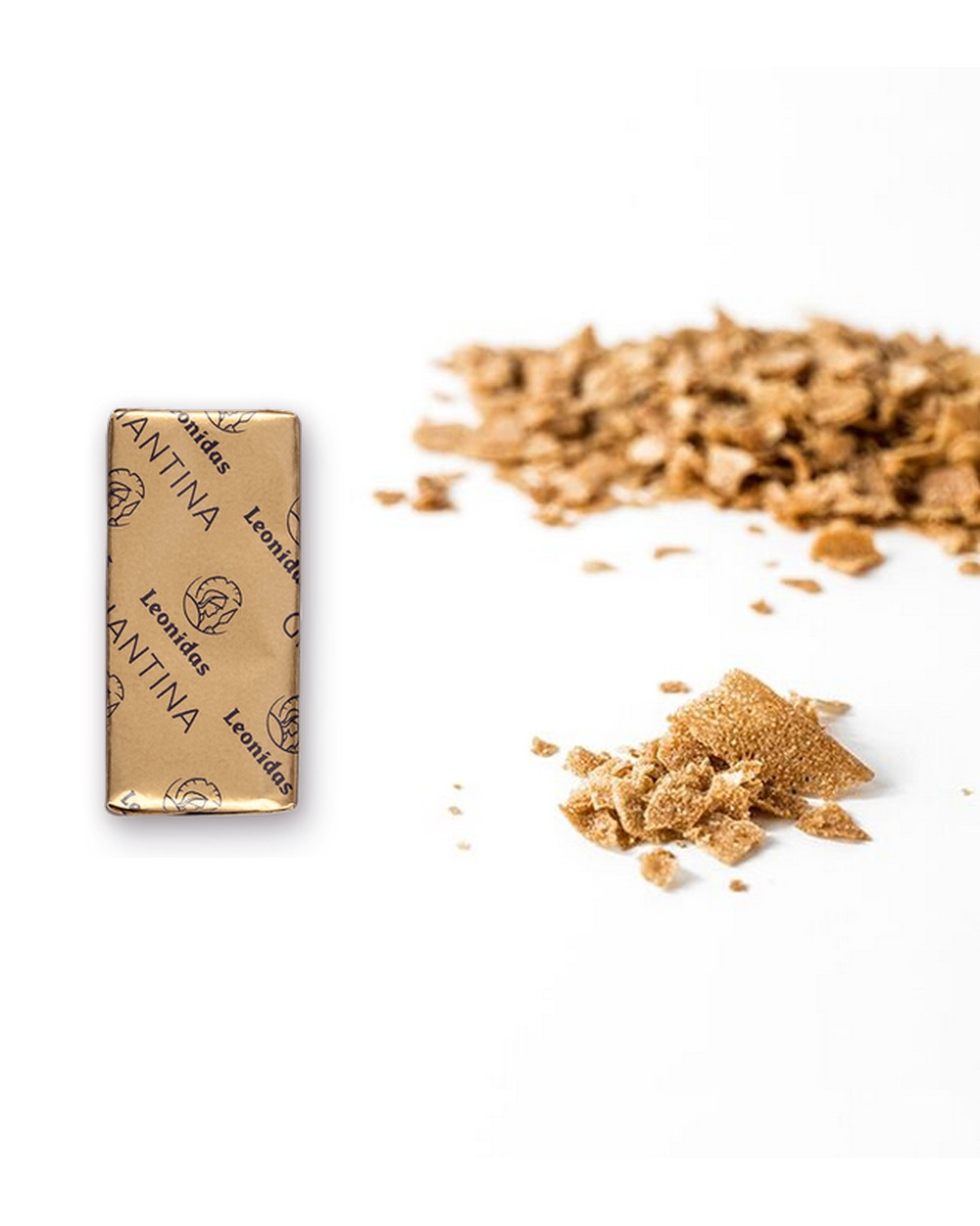 Praline enrobée de chocolat au lait, garnie d’un praliné feuilleté aux éclats de biscuits, offrant une texture croquante et fondante à la fois.