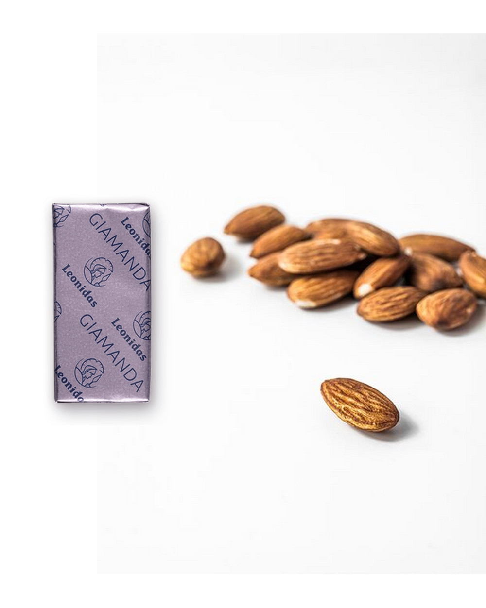 Praline au chocolat au lait, garnie d’un praliné pur amande agrémenté de morceaux d’amandes caramélisées.
