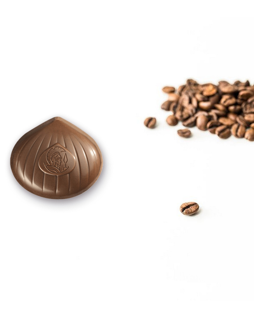Praline en forme de marron avec enrobage de chocolat au lait et cœur de praliné délicatement parfumé au café.