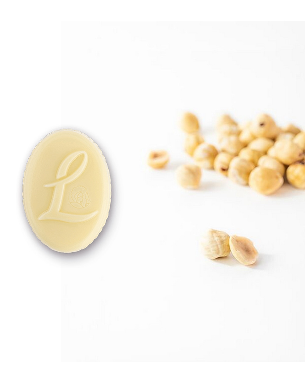 Praline au chocolat blanc, garnie d’un praliné à la saveur caramel et aux noisettes caramélisées.