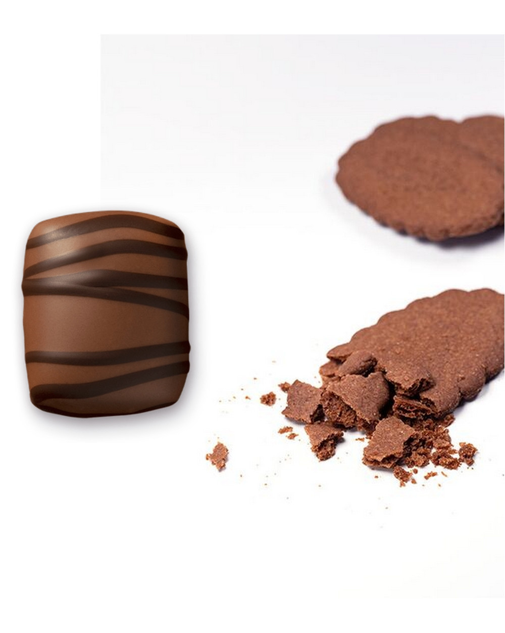 Praline enrobée de chocolat au lait, fourrée d’un praliné croquant aux éclats de spéculoos et décorée de stries de chocolat noir.