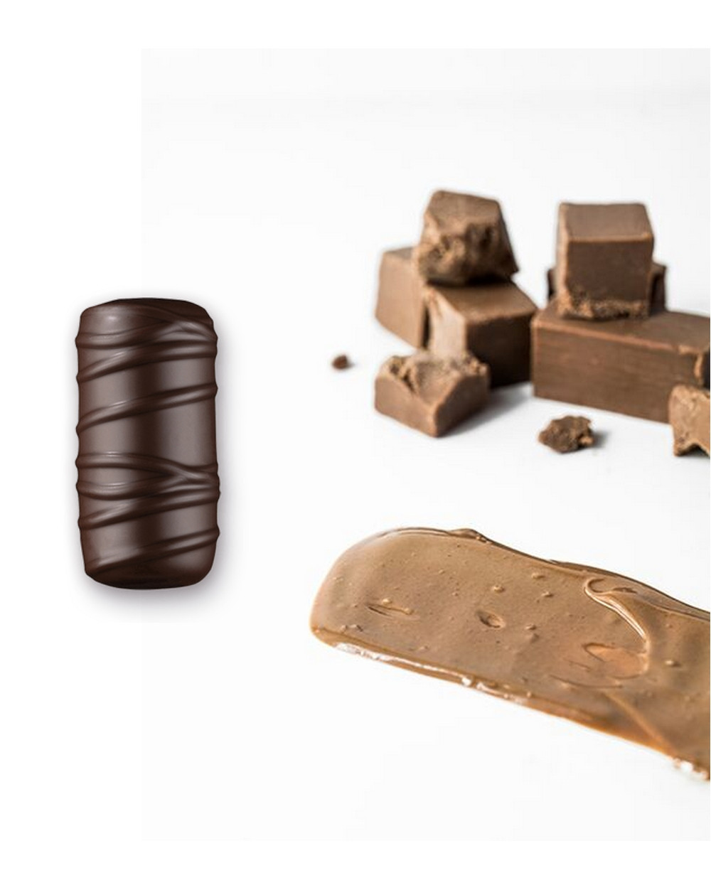 Praline enrobée de chocolat noir, garnie d’un praliné tendre à la texture onctueuse et au goût intense de cacao.