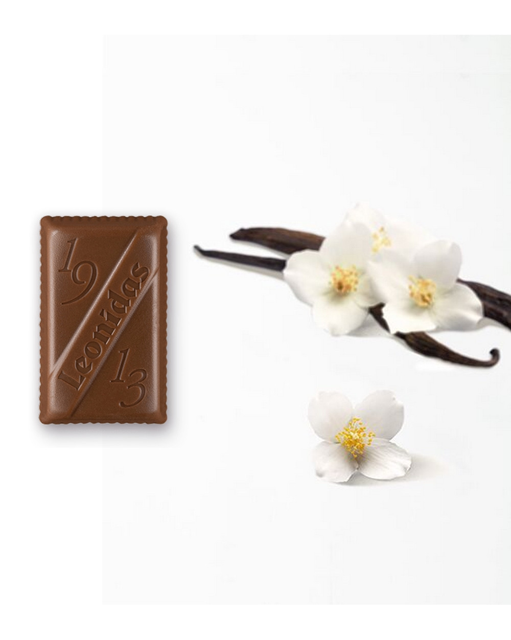 Praline enrobée de chocolat au lait, garnie d’une crème au beurre à la vanille sur une fine couche de praliné, pour un équilibre subtil entre douceur et intensité.