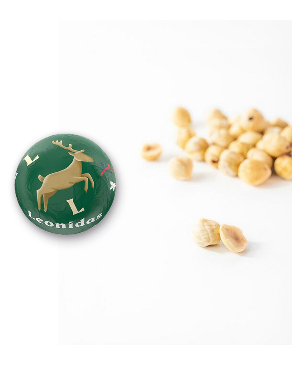 Praline en forme de boule de Noël, enrobée de chocolat blanc et garnie d’un praliné fondant aux noisettes grillées. Une douceur festive qui allie l’onctuosité du chocolat blanc à la richesse du praliné aux noisettes.